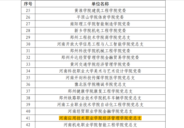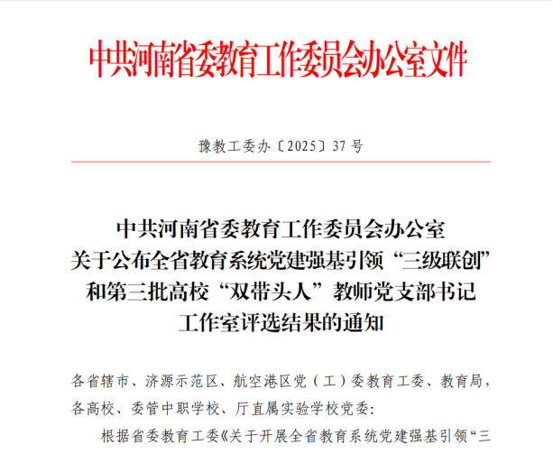 近日,省委教育工委印发《关于公布全省教育系统党建强基引领“三级联创”和第三批高校“双带头人”教师党支部书记工作室评选结果的通知》(豫教工委办〔2025〕37号),经济管理学院党总支成功获评“全省高校党建工作标杆院系”培育创建单位。