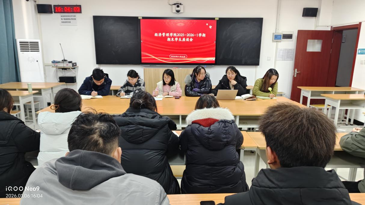 为深入了解学生校园生活情况,精准把握教学与服务保障工作中的薄弱环节,2026年1月6日,经济管理学院在E309教室召开2025-2026学年第一学期期末学生座谈会。经济管理学院副院长凌端平、党政办主任李力、各教研室主任参与座谈,与各专业学生代表围绕学业成长与校园生活展开深入交流。