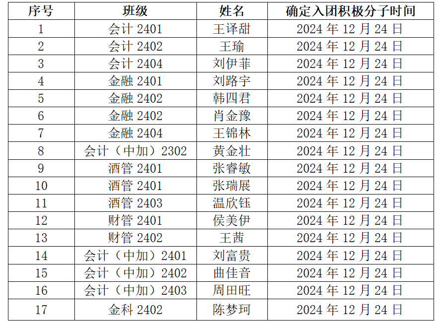 根据《中国共产主义青年团章程》中对发展团员的要求及《发展团员工作细则》等有关规范,严格落实推优入团、评议入团等制度,经学生个人自主申请,各团支部民主推荐,经济管理学院团总支严格按照新发展团员条件及本人综合表现情况,拟确定王译甜等17名同学为本次团员拟发展对象。现进行公示: